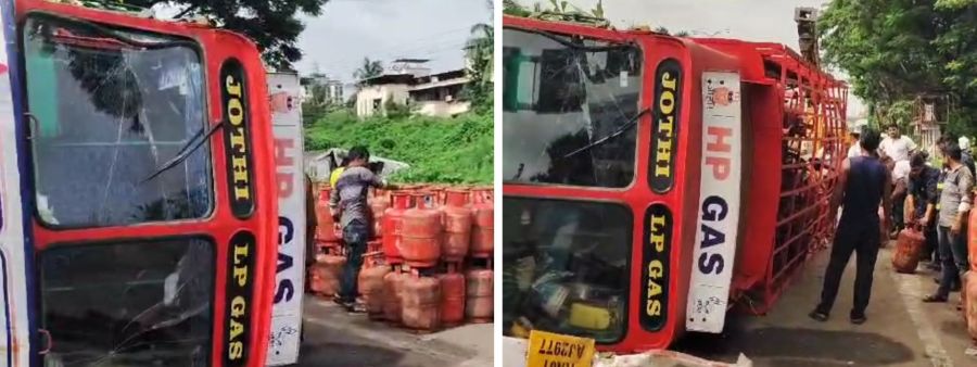 गॅस सिलेंडरने भरलेला ट्रक भररस्त्यात झाला पलटी
