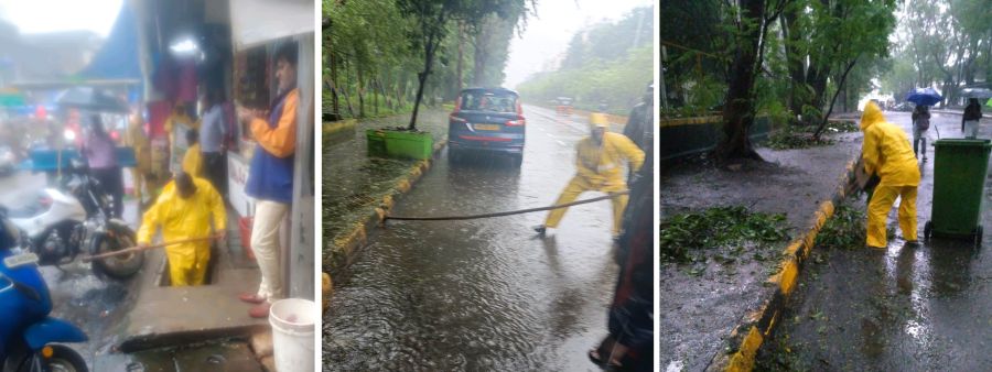पावसाची संततधार स्थिती पाहून नमुंमपा आयुक्त डॉ. कैलास शिंदे रात्रीपासूनच सर्व संबंधितांच्या संपर्कात होते. आपत्ती नियंत्रण कक्षातून शहरातील परिस्थितीचा आढावा घेतला जात होता. आयुक्तांच्या मार्गदर्शनाखाली अतिरिक्त आयुक्तांसह विभागप्रमुख आणि सर्व विभाग अधिकारी तथा सहा.आयुक्त अधिनस्त कर्मचाऱ्यांसह मदत कार्यासाठी सज्ज होते. स्वच्छता कर्मचारी पावसात स्वच्छतेची कामे करीत होते. घंटागाड्यांमार्फत कचराही वेळेत उचलण्यात आला. त्यामुळे शहरातील स्वच्छता नेहमीसारखी राहिली. आरोग्य यंत्रणाही नागरी आरोग्य केंद्रापासून रुग्णालयापर्यंत सर्वच स्तरांवर दक्षतेने कार्यान्वित होती. ज्या ठिकाणी वाहत्या पाण्याला अडथळा निर्माण झाल्याची माहिती मिळाली, त्या ठिकाणचे अडथळे दूर करुन पावसाळी पाण्याच्या प्रवाहाला वाट मोकळी करुन देण्यात आली.