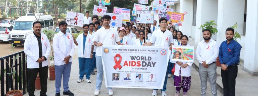 नवी मुंबई : एमजीएम मेडिकल कॉलेज, नेरुळच्या सामुदायिक औषध विभागातर्फे जागतिक एड्स दिनाचे औचित्य साधून ३० नोव्हेंबर रोजी जागतिक एड्स दिनानिमित्त मेळावा व जनजागृती रॅलीचे आयोजन करण्यात आले होते. या रॅलीत ५० विद्यार्थी आणि प्राध्यापकांनी सहभाग घेतला. महाविद्यालयाच्या अधिष्ठाता डॉ.संध्या खडसे आणि सामुदायिक औषध विभागाचे विभागप्रमुख डॉ. विश्वजीत एम. चव्हाण हे प्रमुख उपस्थित होते.