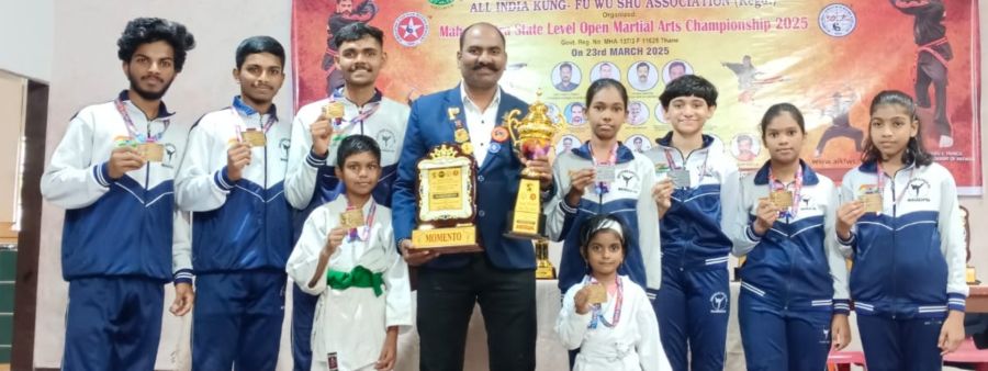 नवी मुंबई : सी वूड्स येथे २३ मार्च रोजी पार पडलेल्या महाराष्ट्र राज्यस्तरीय खुल्या मार्शल आर्ट्स चॅम्पियनशिप २०२५ मध्ये या स्पर्धेमध्ये छावा प्रतिष्ठानच्या विद्यार्थ्यांनी वेफन्स या इव्हेंटमध्ये ७ गोल्ड मेडल्स आणि २ सिल्वर मेडल्सची कमाई केली. छावा प्रतिष्ठान नवी मुंबईचे संस्थापक अध्यक्ष वस्ताद अमित गडांकुश यांना स्पर्धेचे आयोजक शिभु फ्रान्सिस यांच्या हस्ते प्रथम क्रमांकाची ट्रॉफी देऊन सन्मानित करण्यात आले.