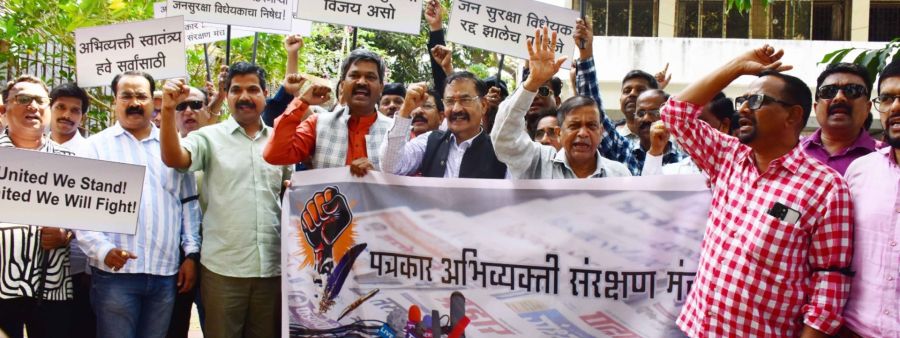 मुंबई : महाराष्ट्र सरकारच्या नव्याने आणलेल्या अभिव्यक्ती स्वातंत्र्य कायद्याविरोधात राज्यातील पत्रकार संघटनांनी तीव्र विरोध दर्शवत मुंबई मराठी पत्रकार संघ येथे ‘पत्रकार अभिव्यक्ती संरक्षण मंच'च्या माध्यमातून निदर्शने केली. सदर कायदा माध्यमांच्या स्वातंत्र्यावर गदा आणणारा असल्याचा आरोप यावेळी सर्व पत्रकार संघटनांनी केला. तसेच सरकारने विधेयक त्वरित मागे घेण्याची मागणी करण्यात आली. अन्यथा यापुढील आंदोलन राज्यात तीव्र करु, असा इशारा दिला. दरम्यान, विशेष जनसुरक्षा विधेयक रद्द करावे यासाठी लवकरच पत्रकार संघटनांच्या वतीने राज्यपाल, मुख्यमंत्री, उपमुख्यमंत्री यांची भेट घेऊन निवेदन देण्यात येणार आहे.